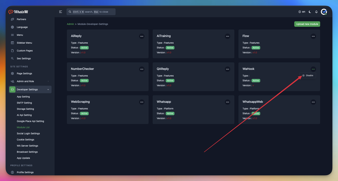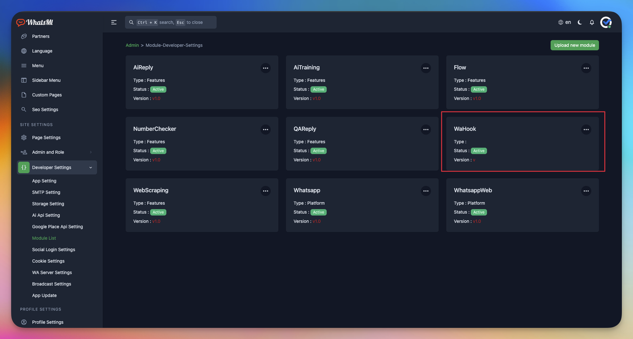 go to your whatsml application -> admin end -> Developer Settings -> Module List -> Upload new module