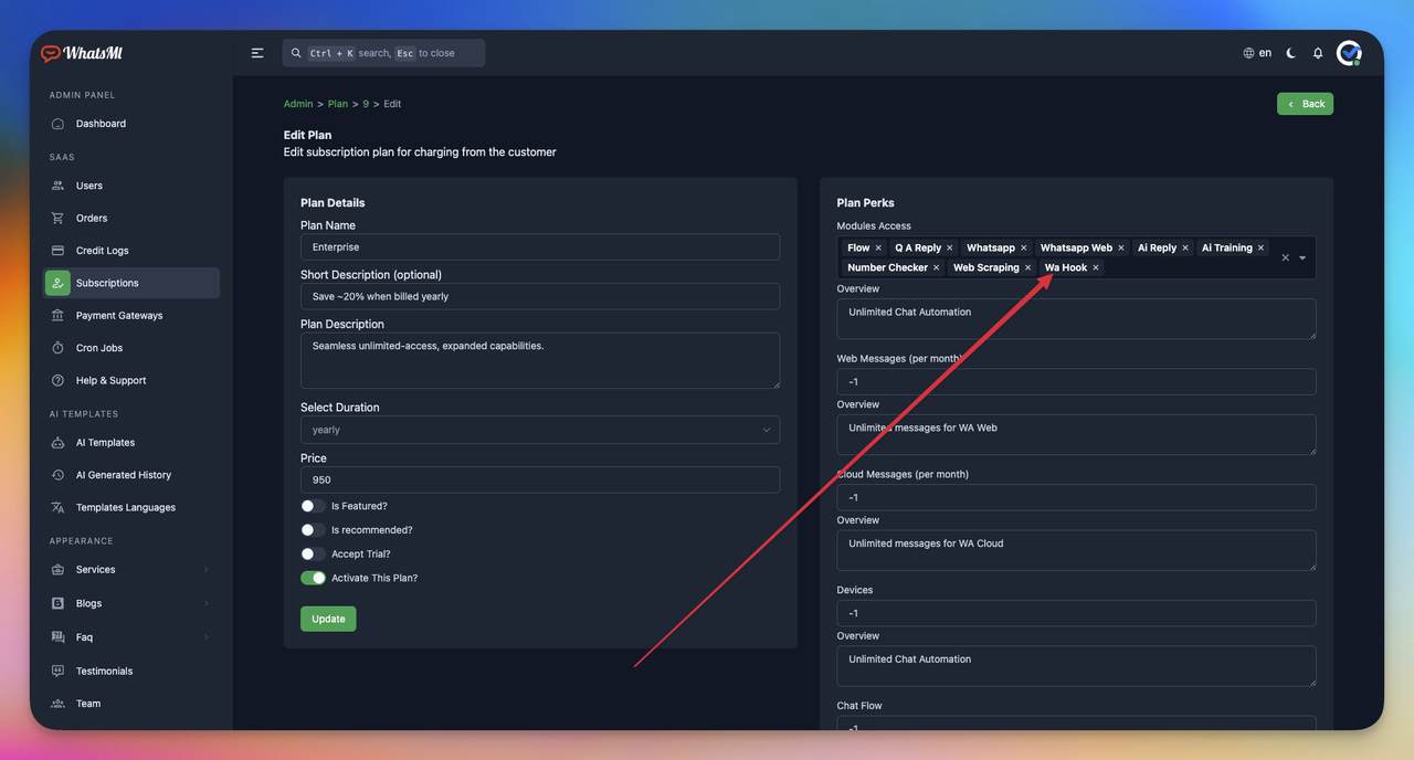 After Activate the module you can see the options in the plan